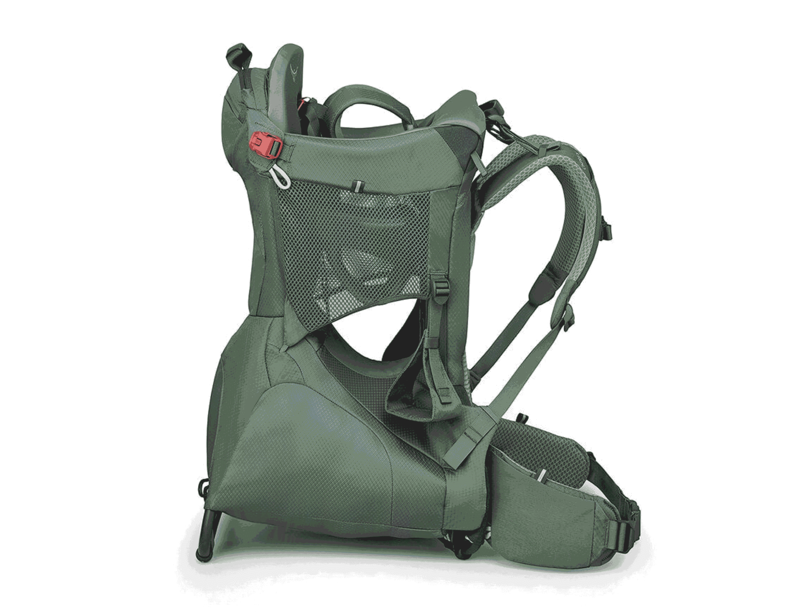 The adjustable AirSpeed backpanel keeps airflow moving between you and the pack, helping you stay cooler and more comfortable on longer walks or hikes. An adjustable hipbelt and mesh hip pockets provide a secure fit while keeping small essentials close at hand. The folding frame adds structure and stability, and dual grab handles make lifting and loading the carrier easier when traveling with kids.